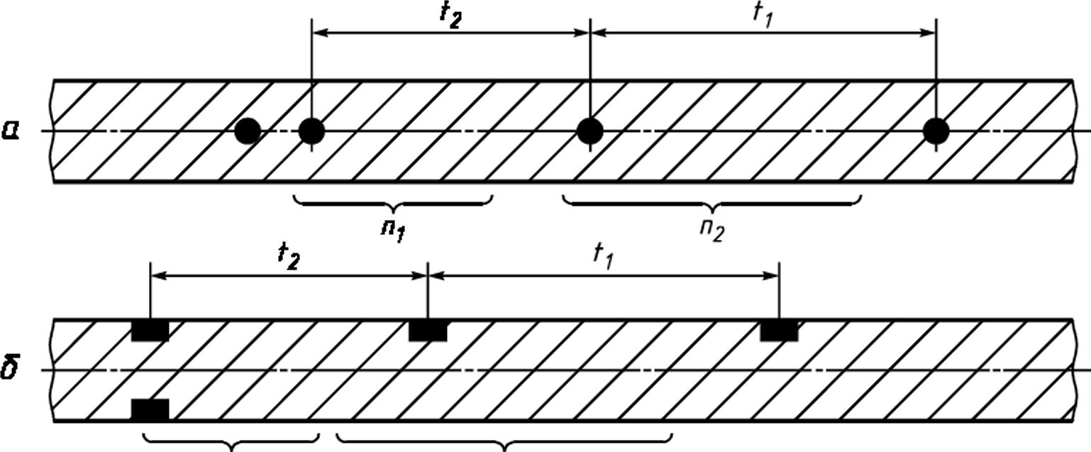1.2 За знаком начала маркировки обозначают предприятие-изготовитель числом поперечных выступов n1в интервале t2 между маркировочными знаками в виде коротких поперечных ребер, расположенных у продольного ребра, или точек на поперечных выступах профиля (см. рисунок Д.1)