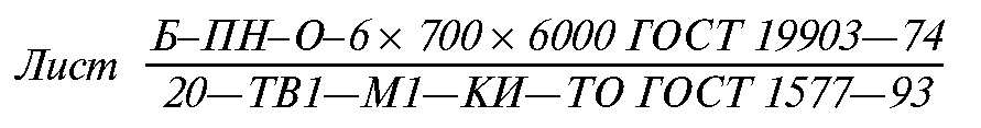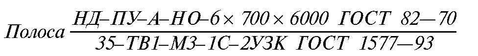 Полоса НД-ПУ-А-НО-6 x 700 x 6000 ГОСТ 82-70/35-ТВ1-М3-1С-2УЗК-ДК2 ГОСТ 1577-93 Примеры условных обозначений, допускаемых в конструкторской документации:
