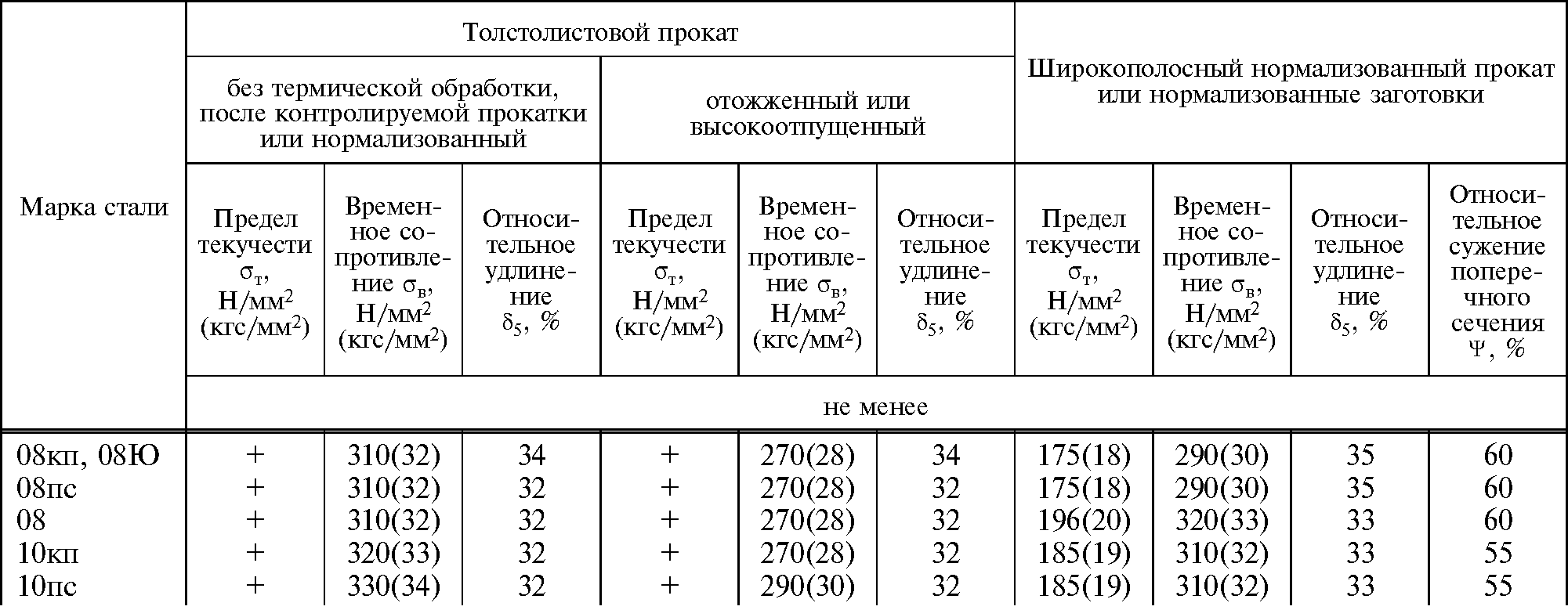 4.2.10 Прокат толщиной до 80 мм из стали марок 08кп, 08пс, 08, 10кп, 10пс, 10, 15кп, 15пс,15, 20кп, 20пс и 20 без термической обработки и со станов непрерывной прокатки с механическими свойствами в соответствии с нормами таблицы 3 для отожженного или высокоотпущенногопроката.