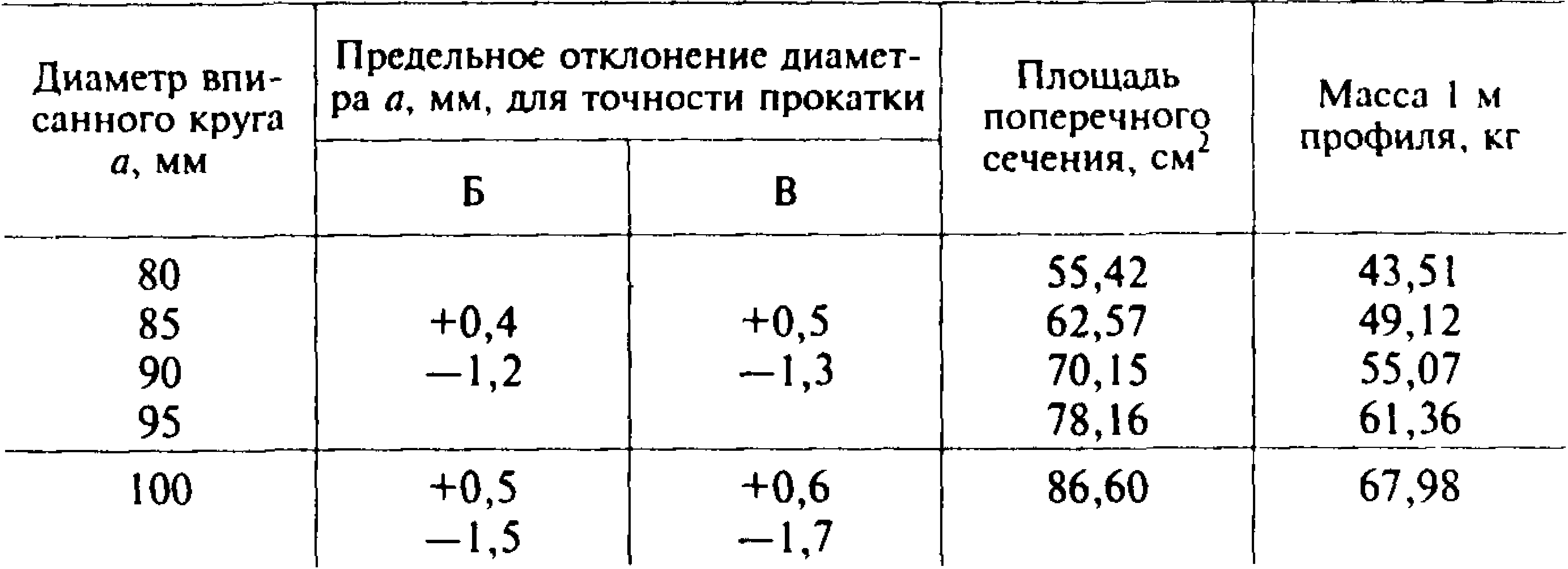 3. Диаметры вписанного круга проката, предельные отклоненияпо ним, площадь поперечного сечения и масса 1 м длины должнысоответствовать указанным на чертеже и в табл. 1.