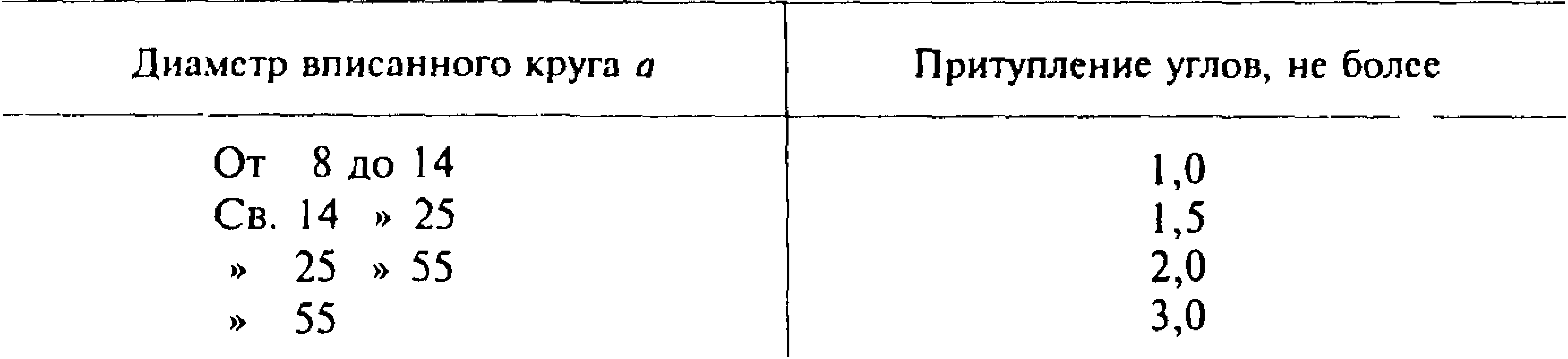 По требованию потребителя притупление углов не должно превышать 1,0 мм для проката диаметром вписанного круга 15—20 мм включительно, от 26 до 30 мм включительно — не более 1,5 мм, от60—75 мм включительно — не более 2,5 мм.