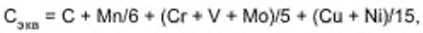 3.14 углеродный эквивалент Сэкв, %: Показатель свариваемости, установленное значение ко торого гарантирует отсутствие холодных трещин при сварке, выраженный в виде приведения к мас совой доле углерода суммы массовых долей углорода. марганца, хрома, ванадия, молибдена, меди и никеля.