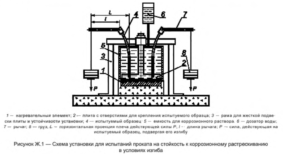 Применяют рычажную установку консольного типа, обеспечивающую постоянно приложенную изгибаю щую нагрузку в течение всего периода испытаний с погрешностью не более 2 %. Схема установки приведена на рисунке Ж.1.