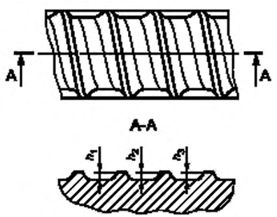 3.7.1 высота ребра h (h1), мм: Расстояние от верхней точки поперечного (продольного) ребра до поверхности тела проката, измеренное перпендикулярно к оси проката (см. рисунки 1— 4).