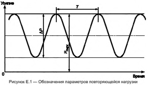Е.З Испытания проводят при температуре (20 +15 -10) °С. при осевом растяжении на действие повторяющейся (пульсирующей) нагрузки, характеризуемой следующими параметрами в соответствии с рисунком Е.1: