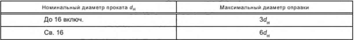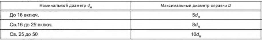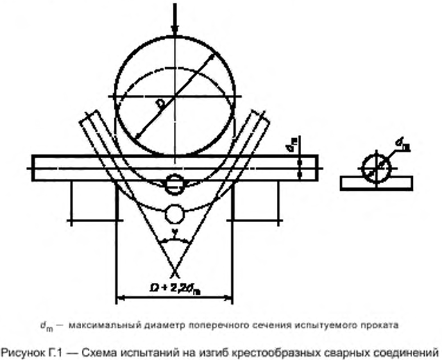 - образцов крестообразных соединений — вокруг оправки диаметром D1 равным 5dH— при диаметре рабоче го стержня до 12 мм включительно или 6dH— при диаметре рабочего стержня более 12 мм. Поперечный стержень (меньшего диаметра) при испытаниях на изгиб должен располагаться в зоне максимального изгибающего момента (рисунок Г.1);