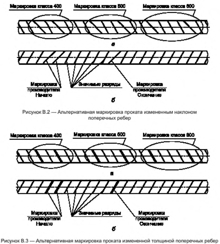 В.2.1 В качестве альтернативной маркировки класса и изготовителя проката может применяться нанесение маркировки проката сочетанием поперечных ребер обычного наклона с ребрами измененного наклона (см. рисунки В.2а и В.26).
