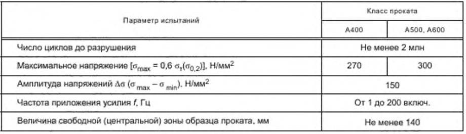 Е.1 Для определения соответствия выносливости проката при многократно повторяющихся циклических на- грузхах требованиям таблицы 8 для проката классов А400. А500 и А600 и таблицы 9 для проката классов Ап600, А800 и А1000 проводят испытания на выносливость при постановке проката на производство, а затем не реже одного раза в год.