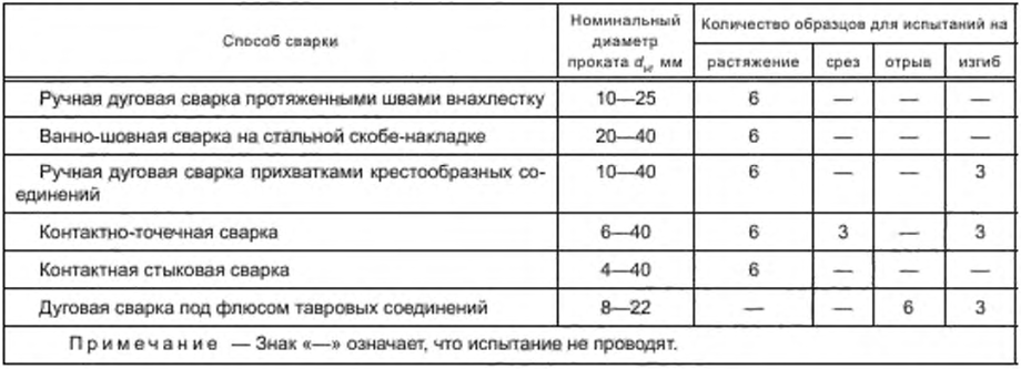 Г.1 Контроль свариваемости (пригодности к сварке) проката соответствующего номинального диаметра про водят путем испытания широко применяющихся в строительстве и в наибольшей степени влияющих на механиче ские свойства сварных соединений в соответствии с таблицей Г.1.
