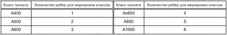 В.2.3 Маркировку класса проката выполняют в зашифрованном виде на одной стороне ребер. Одно ребро с измененным углом наклона (рисунок В.2э) или одно утолщенное ребро (рисунок В.За) определяют начало считы вания маркировки класса проката. Далее следуют ребра с обычным утлом наклона или ребра обычной толщины. Их количество показывает шифр класса в соответствии с таблицей В. 1. Окончание считывания маркировки класса проката определяют одним ребром с измененным углом наклона или одним утолщенным ребром.