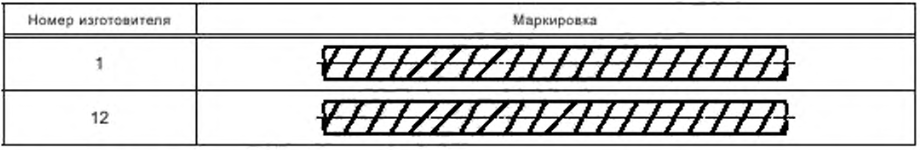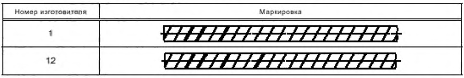 Допускается маркировку изготовителя наносить цифрами, соответствующими присвоенному номеру по та блице В.2. Пример маркировки приведен на рисунке В.1е.