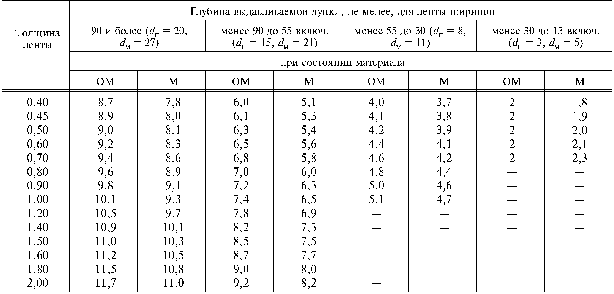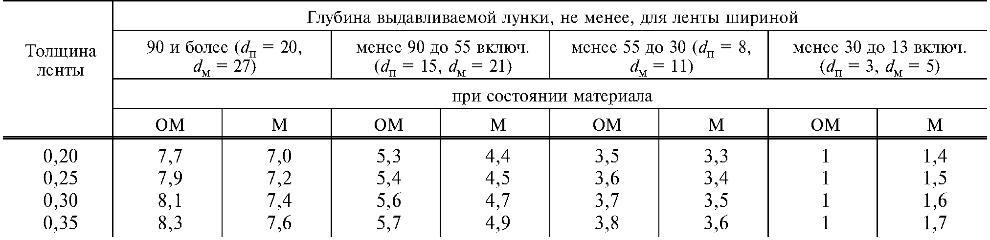 2.8. По требованию потребителя особомягкая и мягкая лента толщиной от 0,20 до 2,00 ммдолжна выдерживать испытания на выдавливание. Минимальная глубина выдавливаемой лункидолжна соответствовать нормам, указанным в табл. 5.