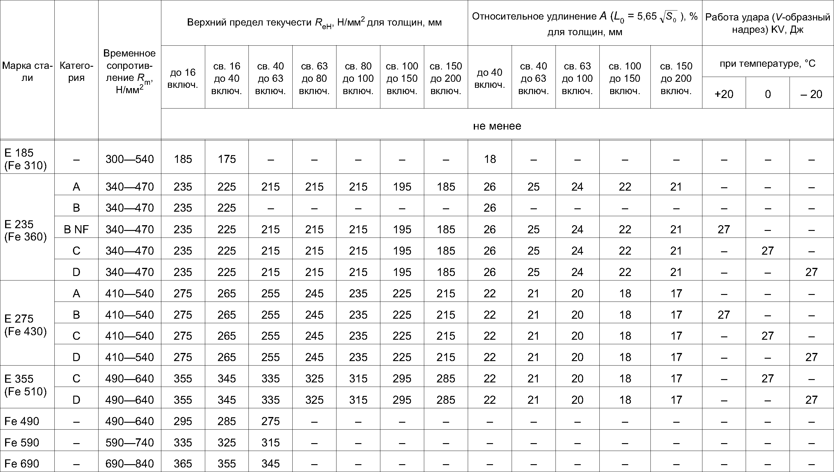 - Для проката из стали марок Е 235 (Fe 360), Е 275 (Fe 430), Е 355 (Fe 510) толщиной свыше 100 мм допускается снижение нижнего значения временного сопротивления на 20 Н/мм2.