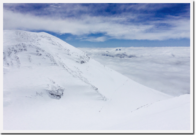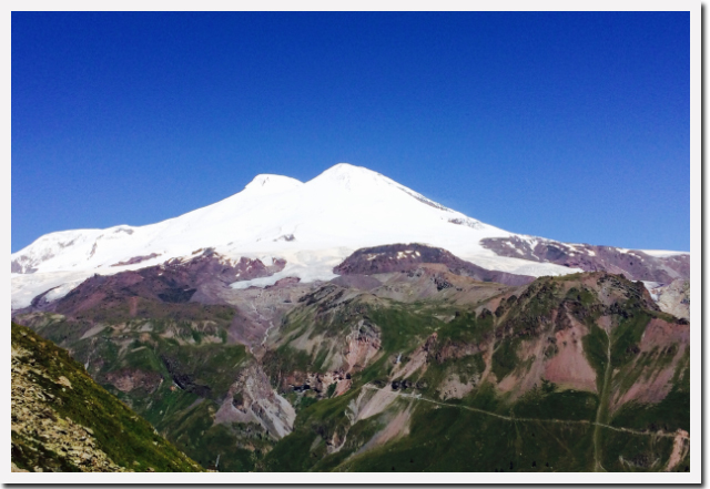 При спуске погода начала улучшаться, открылся удивительный вид на восточную вершину Эльбруса, которая расположена на 20 метров ниже западной и в низу из облаков показалась культовая гора Ушба, которая находится в Сванетии.