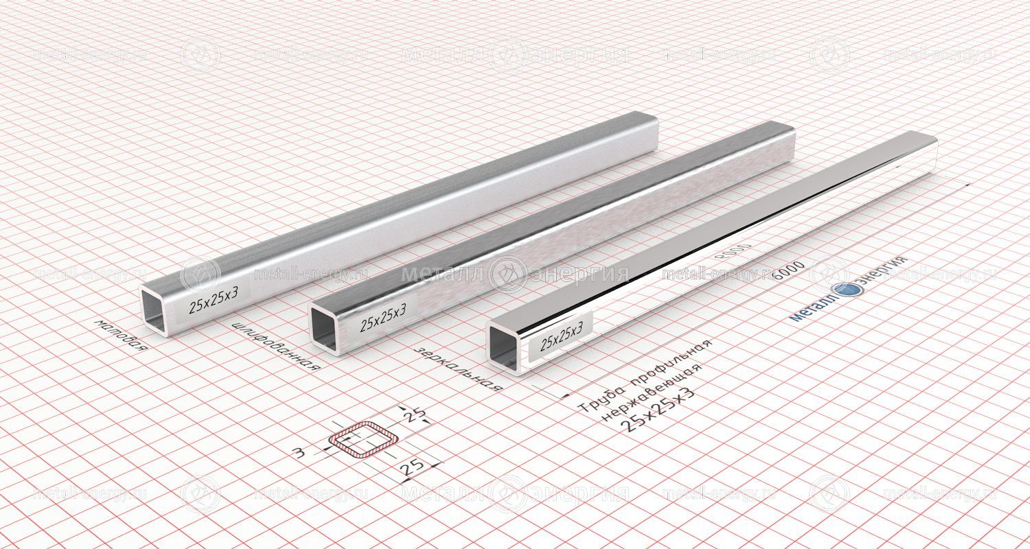 Купить нержавеющую профильную трубу 25х25х3 вы можете любыми партиями: оптом и в розницу. Минимальный объем отгрузки трубы из нержавеющей стали 08х18н10 AISI 304 - одна труба. На складе всегда в наличии труба с матовой, шлифованной и полированной поверхностью.