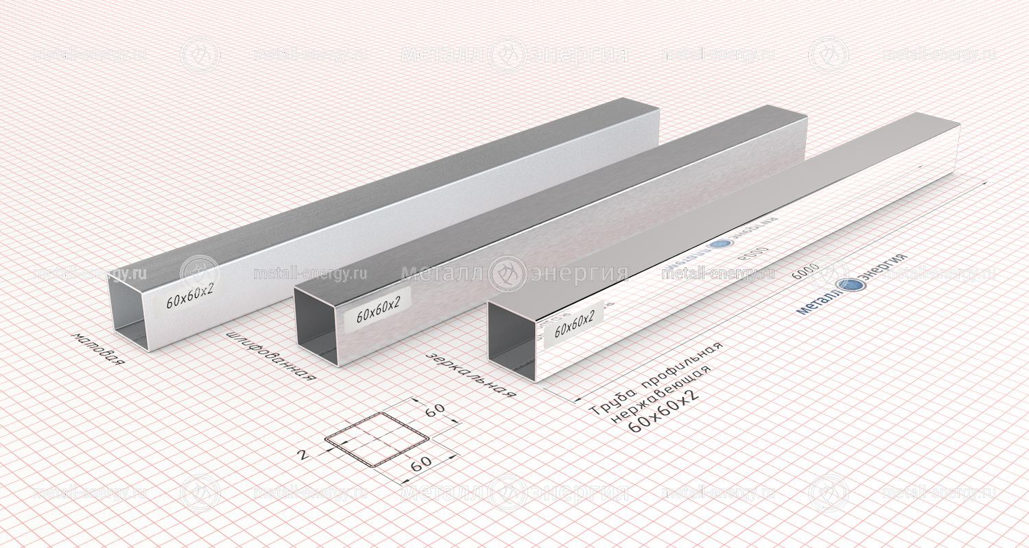 Купить нержавеющую профильную трубу 60х60х2 вы можете любыми партиями: оптом и в розницу. Минимальный объем отгрузки трубы из нержавеющей стали 08х18н10 AISI 304 - одна труба. На складе всегда в наличии труба с матовой, шлифованной и полированной поверхностью.